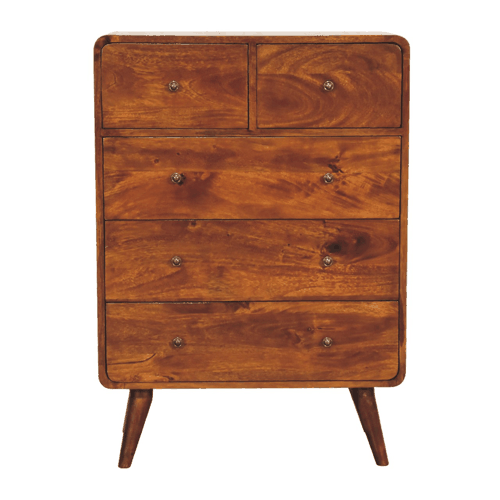 Complementing the rest of the Curved Collection, this 2 over 3 chest of drawers is crafted from 100% solid mango wood with a warm chestnut finish. It stands elegantly on four Nordic-style legs, combining sturdy support with sleek design. Each drawer is fitted with polished accent knobs for easy access, ideal for storing clothes, towels, duvets, and more. The gently curved edges not only ensure safety with smooth corners but also add a modern, contemporary touch—making it a perfect fit for stylish city homes and apartments.