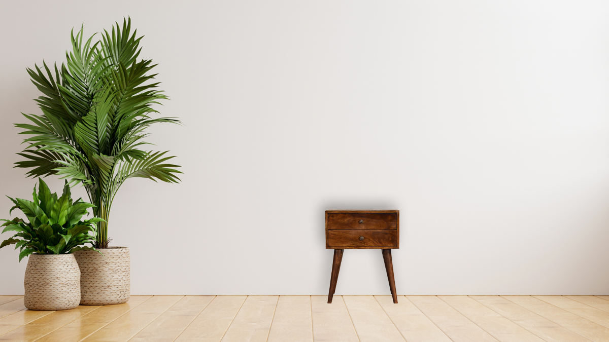 Endlessly versatile, this bedside table makes a perfect stand for nibbles, drinks, or a lamp and will prove handy all over your home. It is made from 100% solid mango wood in an ash black finish and features 2 drawers. Other features include shiny knobs on the drawers and 4 Nordic-style legs.