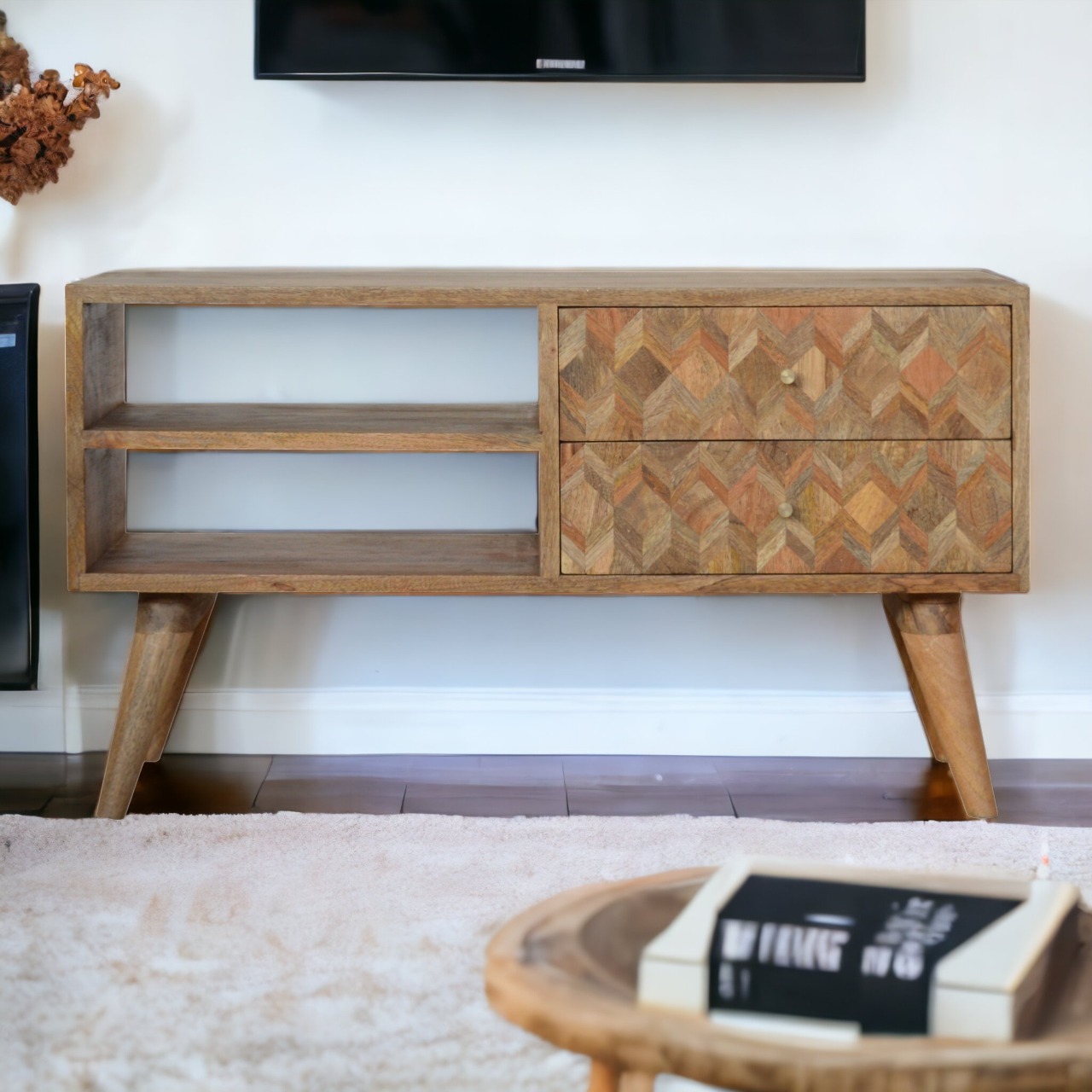 This media unit offers a contemporary and versatile style of furniture for today’s modern interiors. It has been constructed from 100% solid mango wood in an oak-ish finish and finished with a clear lacquer making the product durable and able to withstand years of use. It has an assorted pattern on the drawer fronts using different bits of wood and 2 candle knobs along with 2 open slots for extra storage. The perfect piece for the home which can be used alone or with other pieces from the collection.
