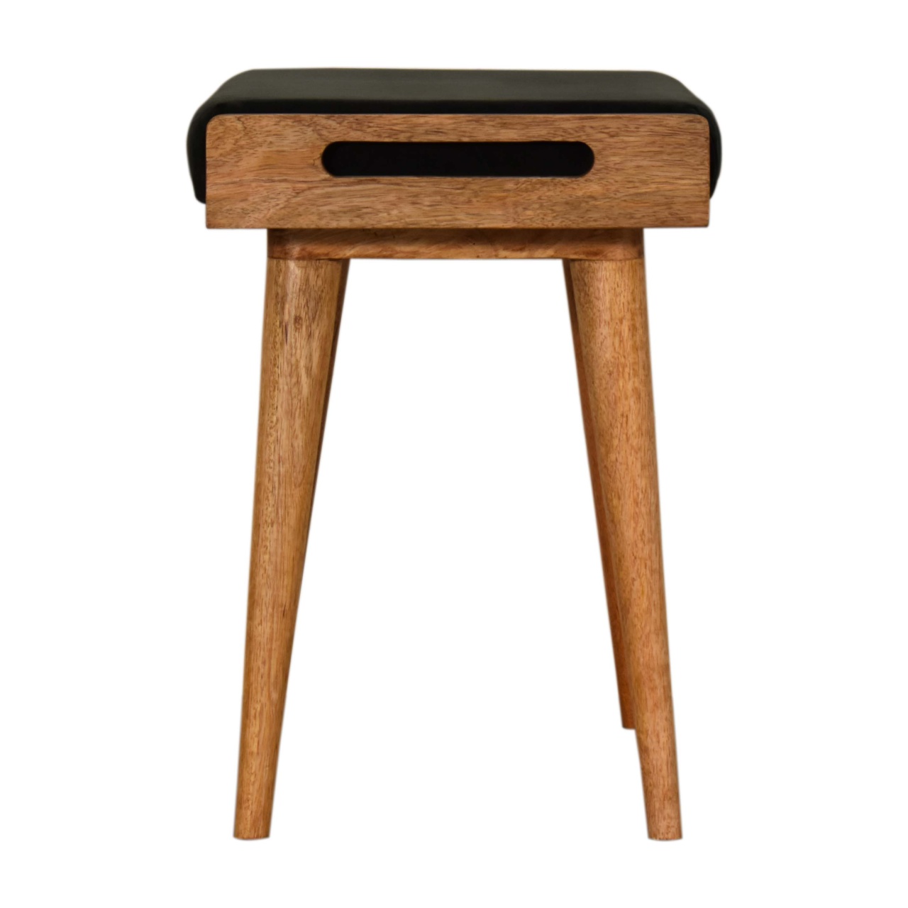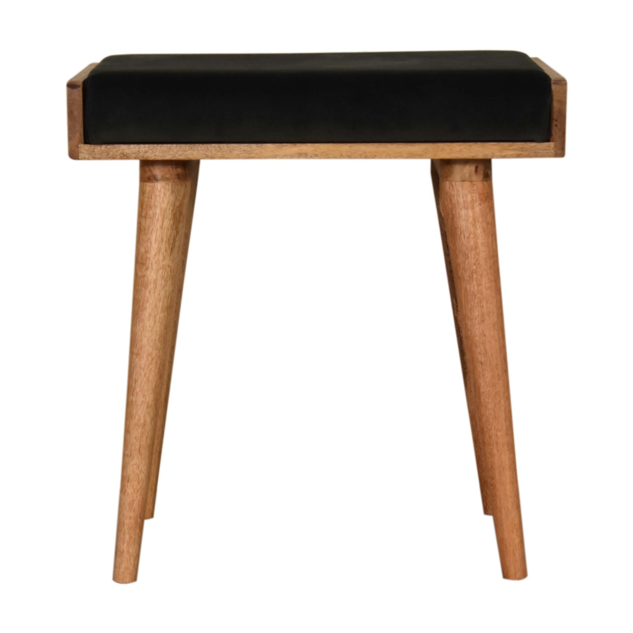 This footstool showcases a sleek tray-style top supported by four Nordic-inspired legs crafted from 100% solid mango wood. Upholstered in luxurious emerald green cotton velvet, it offers a comfortable seating option while adding a touch of elegance to any space. Its clean, modern design effortlessly complements a variety of interior styles, creating a striking contrast between the rich fabric and natural wood.