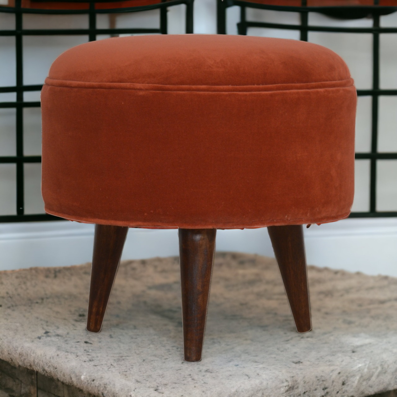 This elegant footstool features a striking combination of rich brick red cotton velvet upholstery and sturdy wooden legs crafted from 100% solid mango wood with a walnut finish. Designed to complement classic Nordic style, it serves perfectly as a footrest, handbag stand, or stylish accent piece. Ideal for adding a vibrant touch to your bedroom, hallway, or living area, this versatile stool brings both color and functionality to any space.