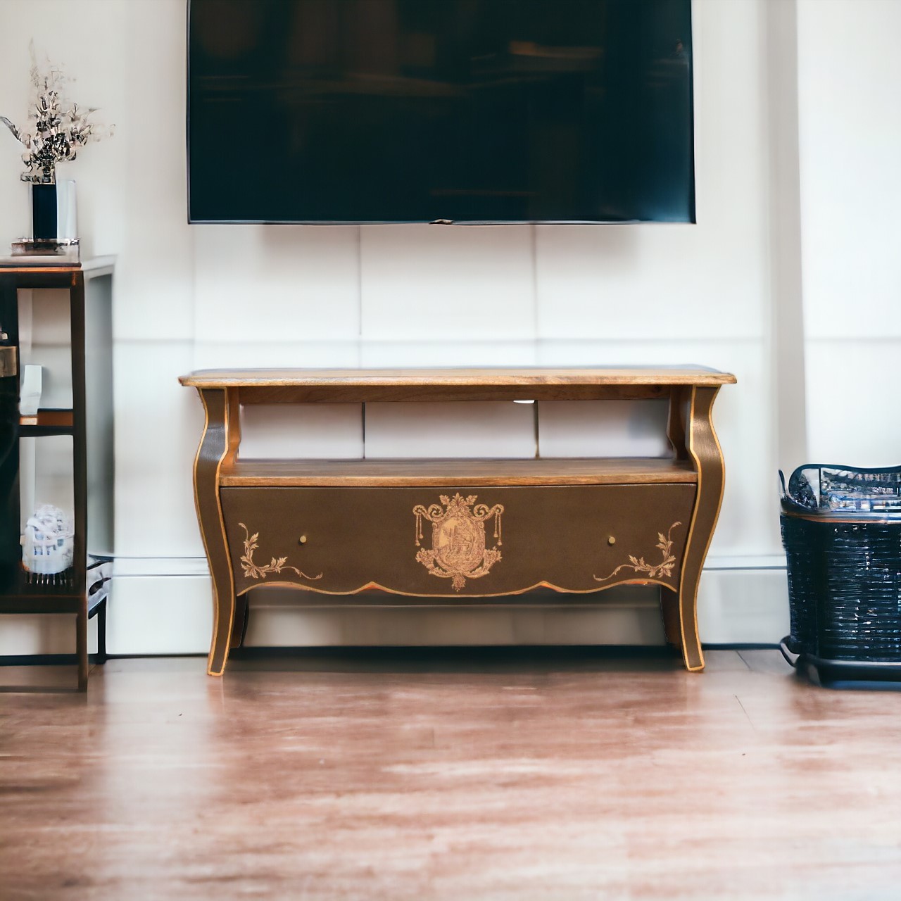 Experience timeless elegance with the Coroner Collection Medis Unit, a stunning French-inspired bedside table finished in a distinctive greyish-green hue. Crafted from solid mango wood, it showcases a natural wood top and drawer interiors, highlighting its quality craftsmanship. The hand-painted, sketched crown crest adds a regal flair, while the refined Chantilly legs and polished brass knobs enhance its sophisticated appeal. Combining durability with classic charm, this exquisite piece is perfect for those seeking a luxurious and enduring addition to their bedroom décor—truly a treasure to be passed down through generations.