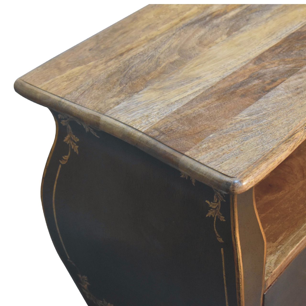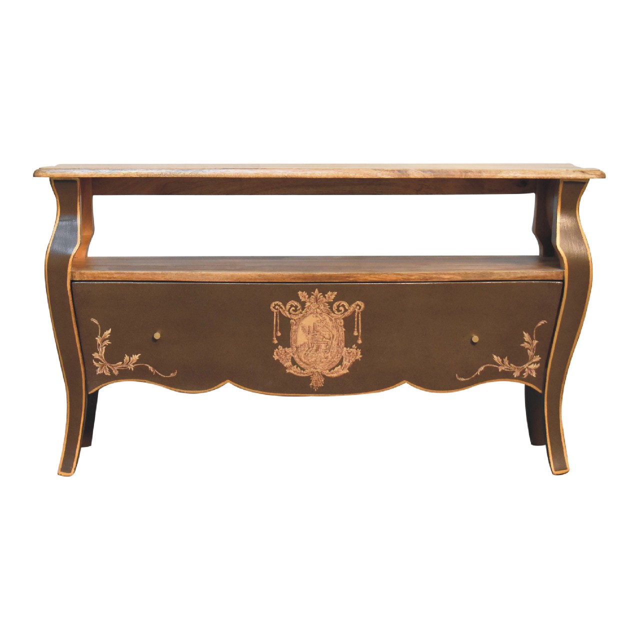 Experience timeless elegance with the Coroner Collection Medis Unit, a stunning French-inspired bedside table finished in a distinctive greyish-green hue. Crafted from solid mango wood, it showcases a natural wood top and drawer interiors, highlighting its quality craftsmanship. The hand-painted, sketched crown crest adds a regal flair, while the refined Chantilly legs and polished brass knobs enhance its sophisticated appeal. Combining durability with classic charm, this exquisite piece is perfect for those seeking a luxurious and enduring addition to their bedroom décor—truly a treasure to be passed down through generations.