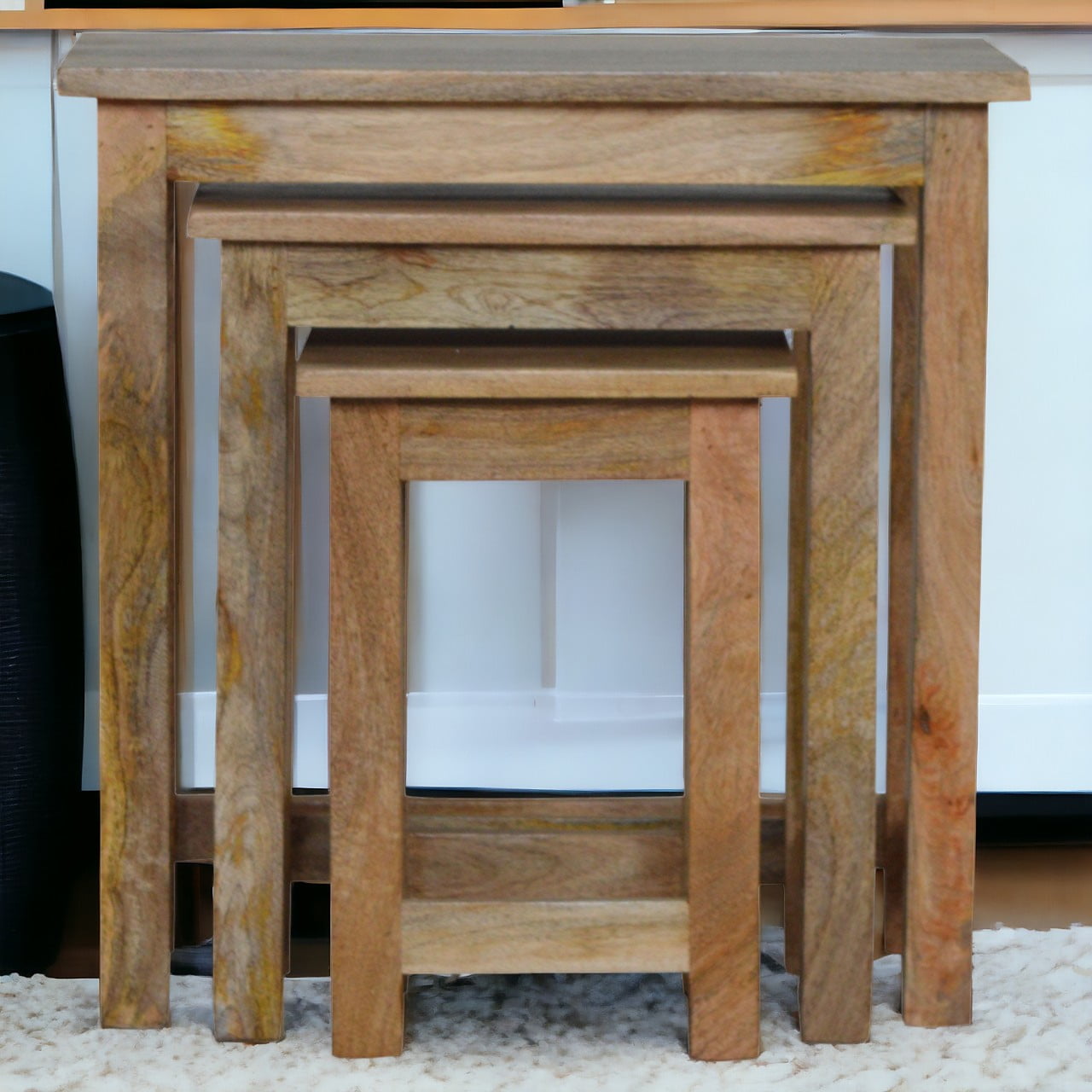 This stool set of 3 is made of 100% mango wood and is perfect for providing extra seating for guests or for everyday use. These strong stools are functional and easy to tuck away when not in use. The stools also work as side tables providing excellent versatility. With their compact size these stools are perfect for use in small spaces and they tuck away when they’re not in use. Each stool is individually hand distressed for a unique look; no two pieces are identical. This piece of furniture has an oak-ish finish. Sold as a Set of 3.