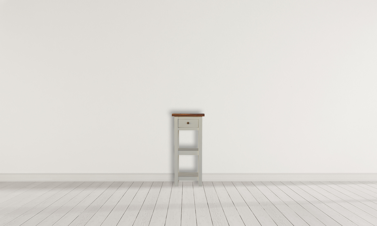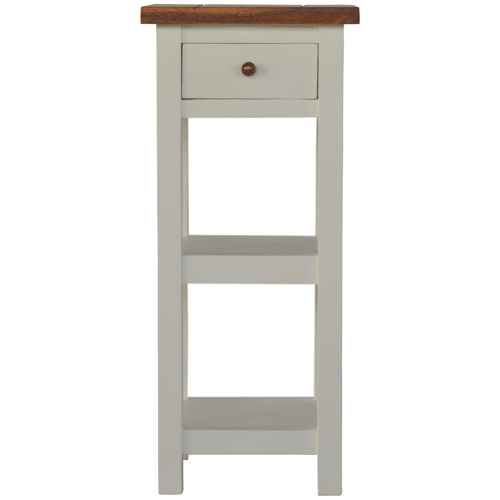This stylish two-toned telephone table features a hand-spray painted white base paired with a warm honey-finished top. The base is crafted from solid mango wood, while the top is made from durable solid acacia wood. Designed for both function and charm, it includes one drawer and one shelf for convenient storage. Additional details include round knobs, straight farmhouse-style legs, and a drawer interior finished in rich honey, adding a cohesive touch to the overall design.