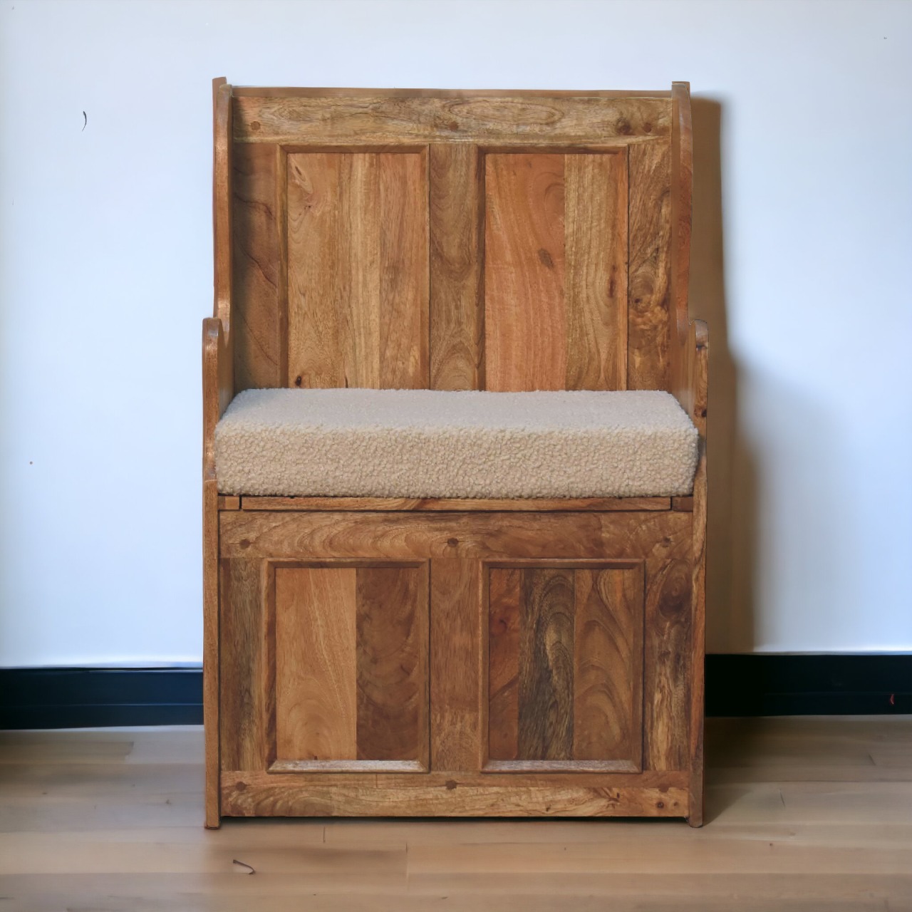 Introducing our Small Monks Storage Bench—a perfect blend of functionality and charm for compact hallways. Crafted by hand from solid mango wood with a warm oak-inspired finish, this bench showcases beautifully carved sides and detailed panel work. Its spacious interior offers generous storage while maintaining a compact footprint. Topped with a soft cream boucle cushion, it adds a refined and cozy touch to your entryway or living space.