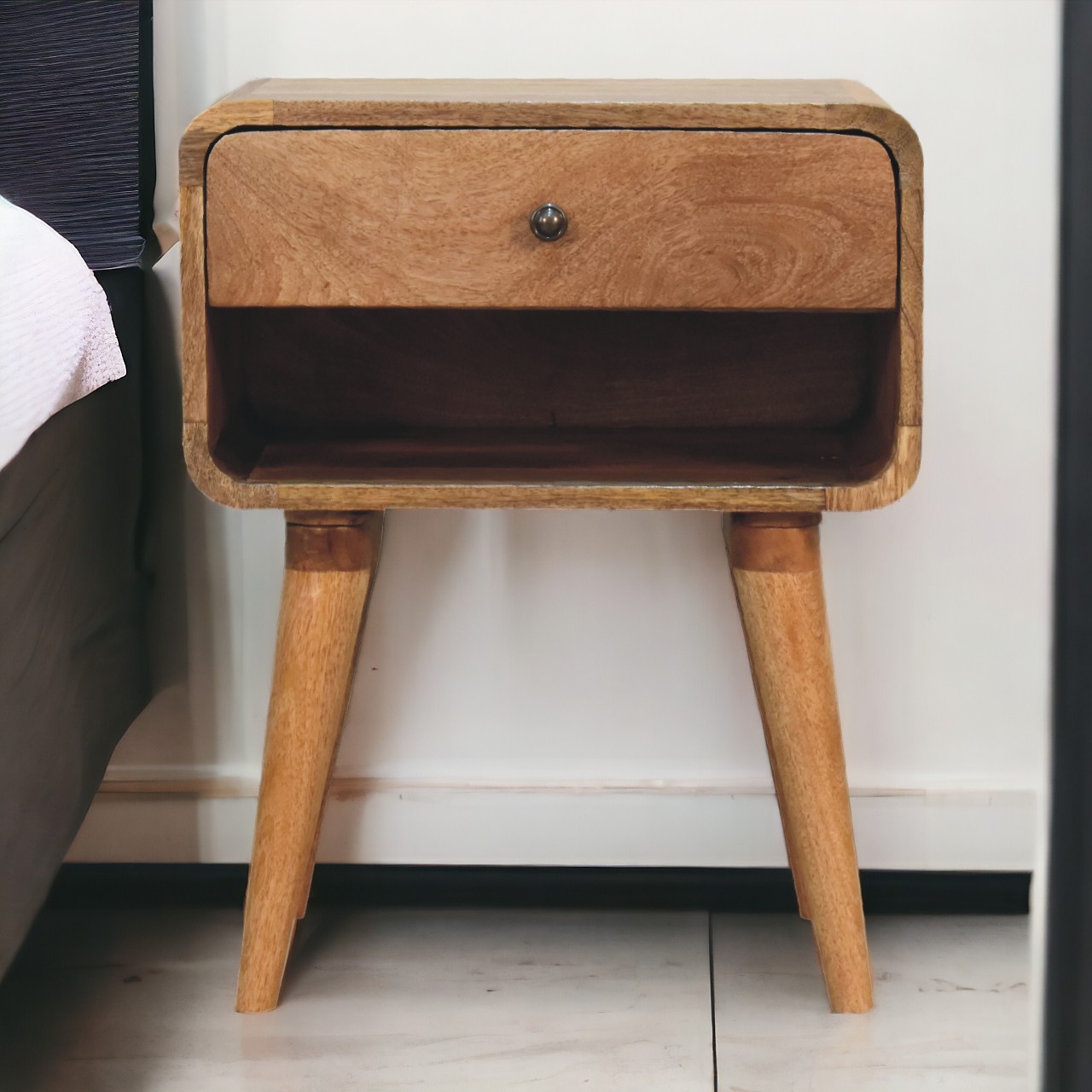 Endlessly versatile, this curved bedside table makes a perfect stand for nibbles, drinks, or a lamp. It will prove handy all over your home and is made from 100% solid mango wood and has a fine oak-ish finish. It has curved edges that will fit into any home/living space. It also has 1 open slot and 1 drawer that has shiny knob and 4 Nordic style legs.
