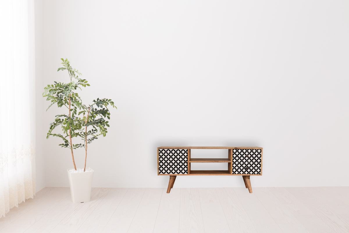 Crafted from 100% solid mango wood, this media unit showcases a sleek oak-inspired finish that adds warmth and elegance to any space. Its standout feature is the screen-printed door and drawer fronts, adorned with a stunning diamond pattern that brings depth and character to the design. Offering practical storage solutions, the unit includes two open compartments and multiple drawers, perfect for neatly organizing your essentials. Elevated on four Nordic-style legs and accented with four polished knobs, this piece combines functionality with stylish Scandinavian flair.