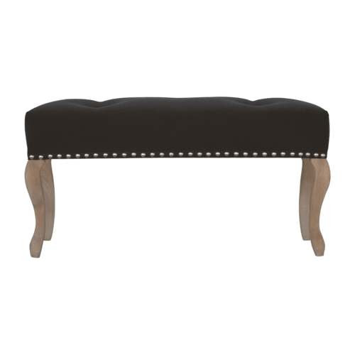Elevate your space with this sophisticated bench, upholstered in luxurious black cotton velvet. Crafted with 100% solid mango wood, its beautifully carved French-style legs offer exceptional strength and durability. Featuring a timeless deep button tufting and studded detailing, this elegant piece effortlessly complements a variety of home interiors, adding a touch of classic charm to any room.