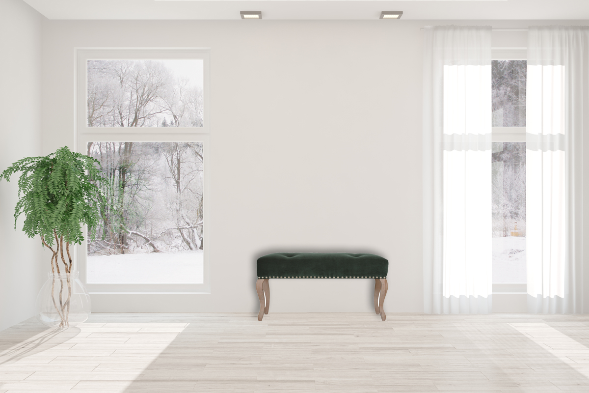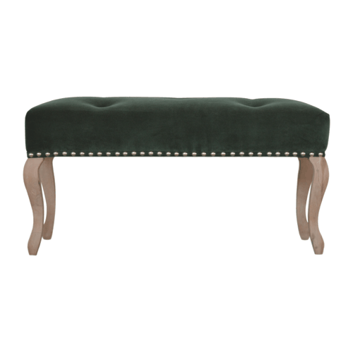 Elevate your space with this sophisticated bench, beautifully upholstered in rich emerald green cotton velvet. Crafted with sturdy, 100% solid mango wood, its carved French-style legs offer both durability and timeless charm. Featuring a deep button-tufted seat and elegant stud detailing, this versatile piece effortlessly complements a variety of home interiors, adding a touch of classic elegance to any room.