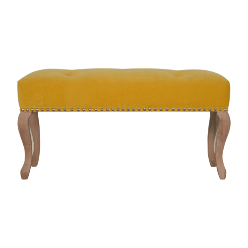 Elevate your space with this elegant bench, beautifully upholstered in rich mustard cotton velvet. Crafted with 100% solid mango wood, its carved French-style legs offer exceptional strength and durability. The bench showcases a sophisticated deep button tufting and studded detailing, blending classic charm with timeless style. Perfectly versatile, this refined piece complements a variety of home interiors, adding a touch of understated luxury to any room.