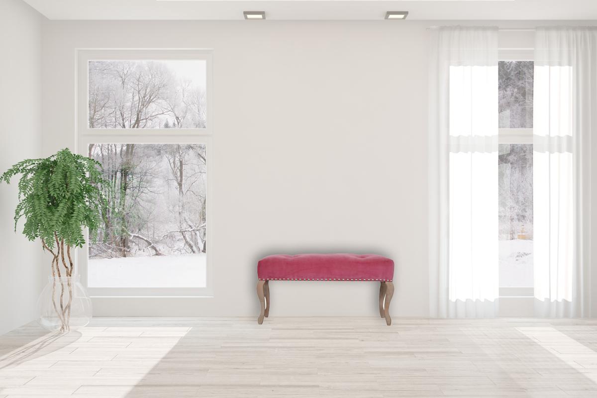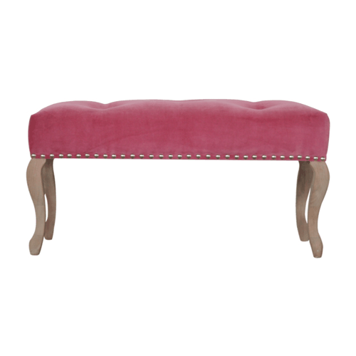 This sophisticated bench is upholstered in soft pink cotton velvet, offering a luxurious touch. It boasts intricately carved French-style legs made from 100% solid mango wood, ensuring both strength and durability. Featuring a deep button-tufted and studded design, this timeless piece effortlessly complements a variety of home decor styles.