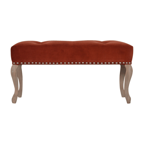 Elevate your space with this elegant bench, beautifully upholstered in rich rust-colored cotton velvet. Crafted with 100% solid mango wood, its carved French-style legs offer exceptional strength and durability. The bench showcases a sophisticated deep button tufting and studded detailing, blending classic charm with timeless style. Perfectly versatile, this refined piece complements a variety of home interiors, adding a touch of understated luxury to any room.
