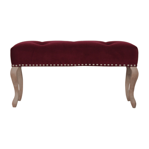 This elegant bench has been upholstered in a wine red cotton velvet fabric. It features carved French style legs constructed from 100% solid mango wood providing strength and durability along with a deep button and studded design. This simple yet classy piece can be incorporated in different home settings and interiors.