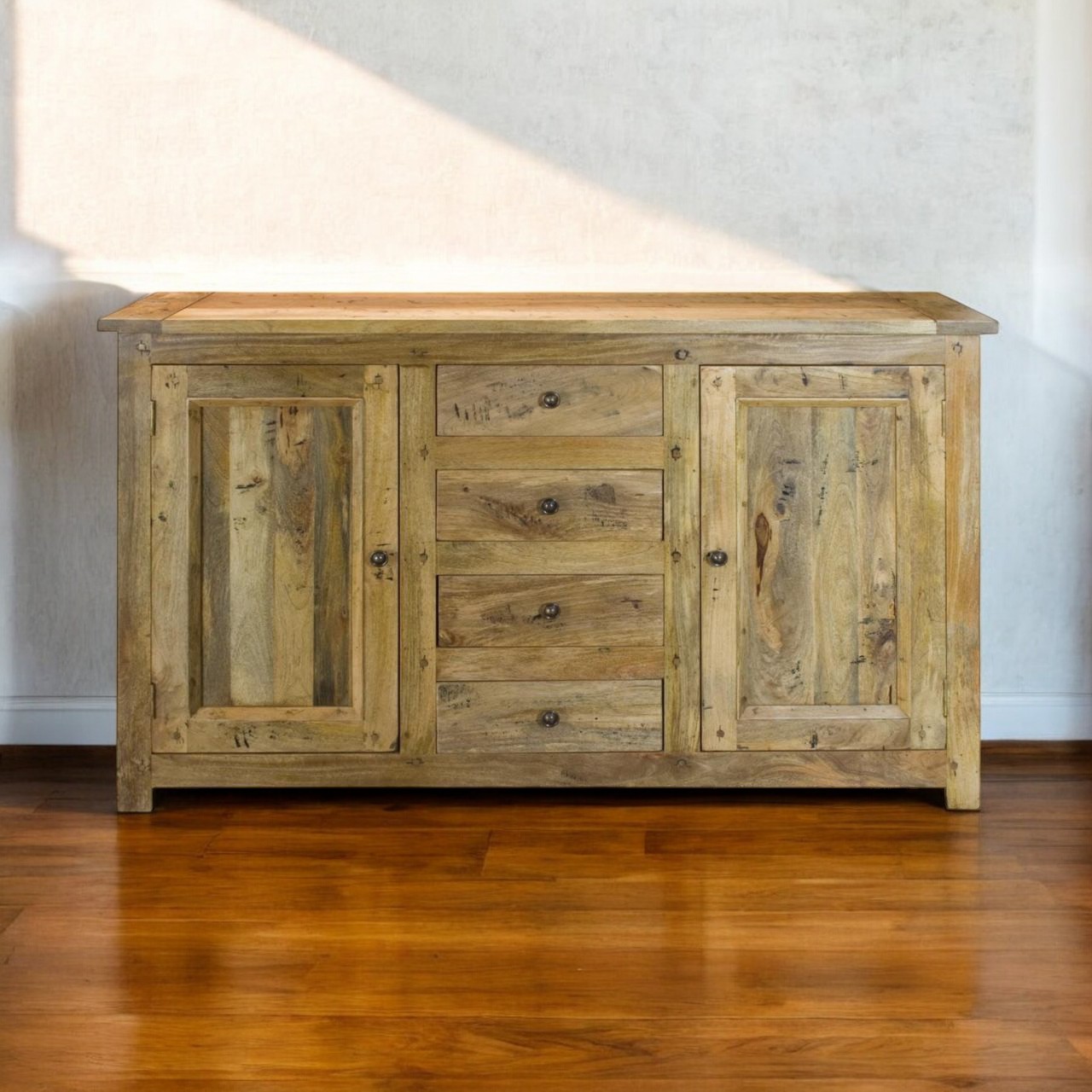 This sideboard is made from 100% solid mango wood with a hand-distressed oak-ish finish which gives the piece a country look whilst its timeless character maintains its traditional charm to create the perfect addition to your home. This product offers excellent storage space with its four drawers and two cabinets that come with shiny knob handles.