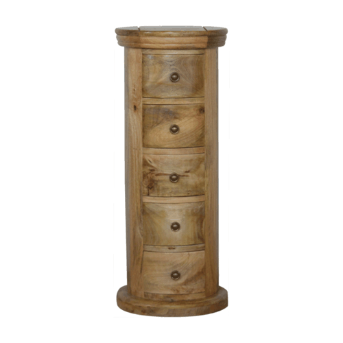 Crafted from 100% solid mango wood, this elegant five-drawer drum chest combines functionality with rustic charm. Featuring five spacious drawers, it provides ample storage for small essentials like keys and loose change, while the top surface is perfect for showcasing photos, ornaments, or collectibles. Each drawer is adorned with polished knobs and finished in a warm oak tone, enhancing its classic appeal. Versatile in design, this piece can serve as a bedside table, end table, or occasional table. Expertly handcrafted in a country style, it showcases traditional woodworking techniques such as wooden pegs, grooves, and breadboard joints for lasting durability and timeless beauty.
