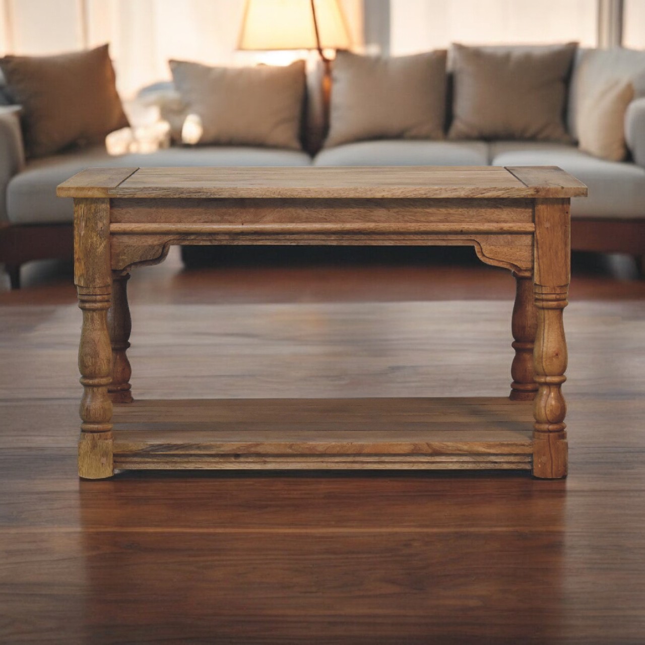 Crafted from 100% solid mango wood, this coffee table showcases a charming hand-distressed oak-like finish accented with grooves and wooden pegs. Its sturdy construction ensures lasting durability, while the hand-turned legs add a touch of rustic country style. Featuring a convenient under-shelf, it provides extra storage space to keep your living area organized. Dimensions: 80 x 50 x 45 cm.
