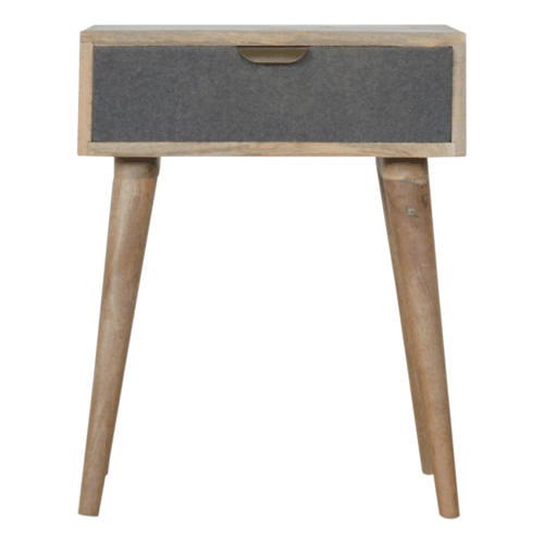This bedside table features a fabric-front drawer upholstered in grey tweed, perfectly complementing the matching fabric-front writing desk. Combining two contrasting materials, it boasts a solid wood body with a warm oak finish and a sleek golden pull-out handle. Supported by four Nordic-style legs, this piece adds a stylish and versatile touch to both modern and country-inspired interiors.