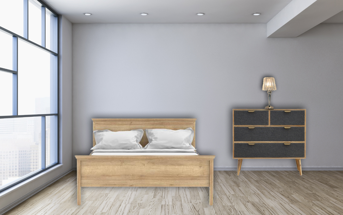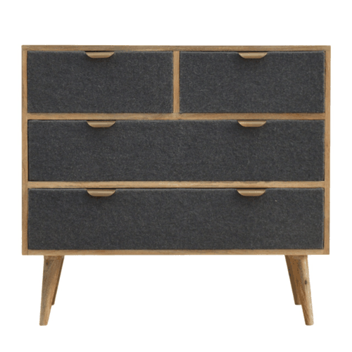 Finished with fabric front drawers, and upholstered in a grey tweed to match perfectly with the fabric front writing desk, this chest takes a different twist on furniture with the contrast of 2 materials and combining them together. It features a solid wood body finished in an oak-ish finish and a golden pull-out handle with 4 Nordic style legs. It is the perfect addition to both modern and country homes. It has 2 large drawers and 2 smaller drawers for storing your clothes or any belongings neatly in the bedroom.