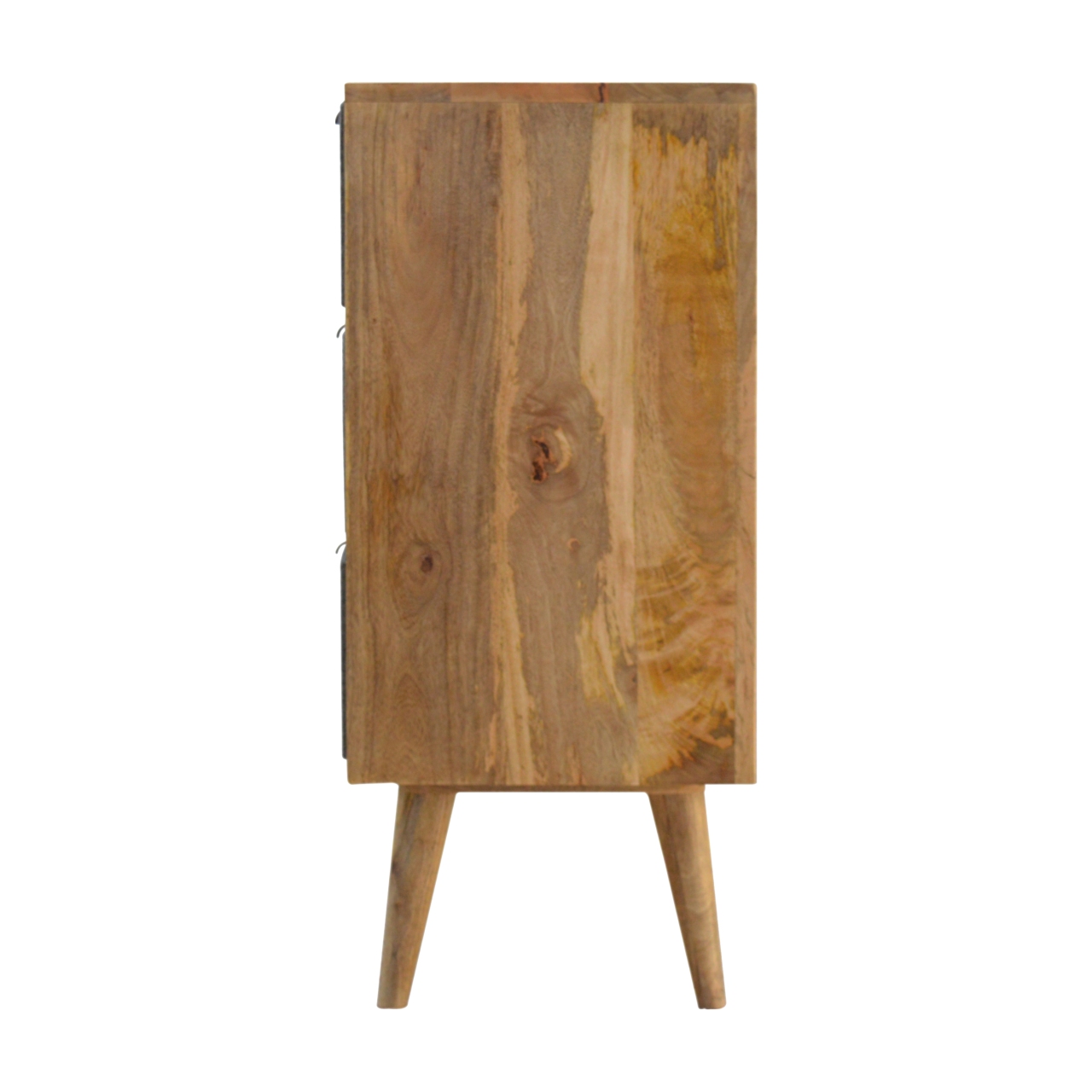 Finished with fabric front drawers, and upholstered in a grey tweed to match perfectly with the fabric front writing desk, this chest takes a different twist on furniture with the contrast of 2 materials and combining them together. It features a solid wood body finished in an oak-ish finish and a golden pull-out handle with 4 Nordic style legs. It is the perfect addition to both modern and country homes. It has 2 large drawers and 2 smaller drawers for storing your clothes or any belongings neatly in the bedroom.