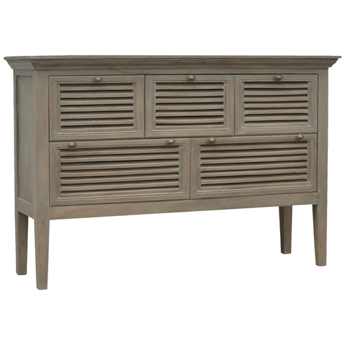 Inspired by charming vintage French window shutters, this sideboard/buffet is an ideal addition to your kitchen. It features five shutter-style drawers, offering ample storage for your plates and cutlery. Finished in a smooth grey wash with a bleached effect, it is complemented by elegant tapered legs and round, polished knob handles for a refined touch.