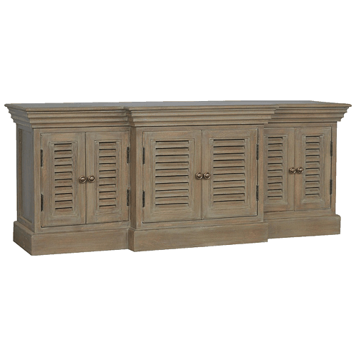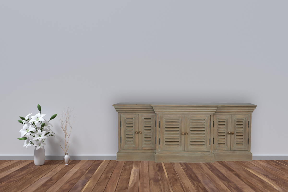 Crafted from 100% Mango Wood and finished with a stylish grey wash bleached effect, this TV unit embodies coastal elegance. It features six French-inspired shutter cabinet doors, each adorned with round knob handles for a classic touch. The spacious top provides ample room for your TV, while the floor-mounted design ensures sturdy support and a sleek, grounded look.
