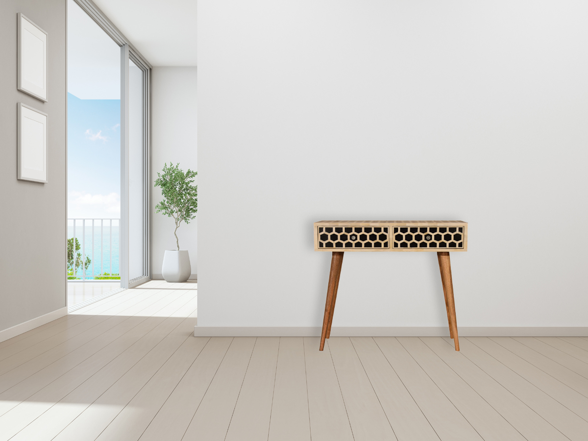 This console table boasts a sleek and minimalist design that complements a variety of home styles. It features a beautiful oak-inspired finish and includes two bone inlay drawers adorned with an elegant honeycomb pattern and accented by two glass knobs. The table stands on four Nordic-style legs, adding a touch of Scandinavian charm. The bone inlay is ethically sourced from naturally deceased animals, including camels, goats, and buffaloes, ensuring responsible craftsmanship.