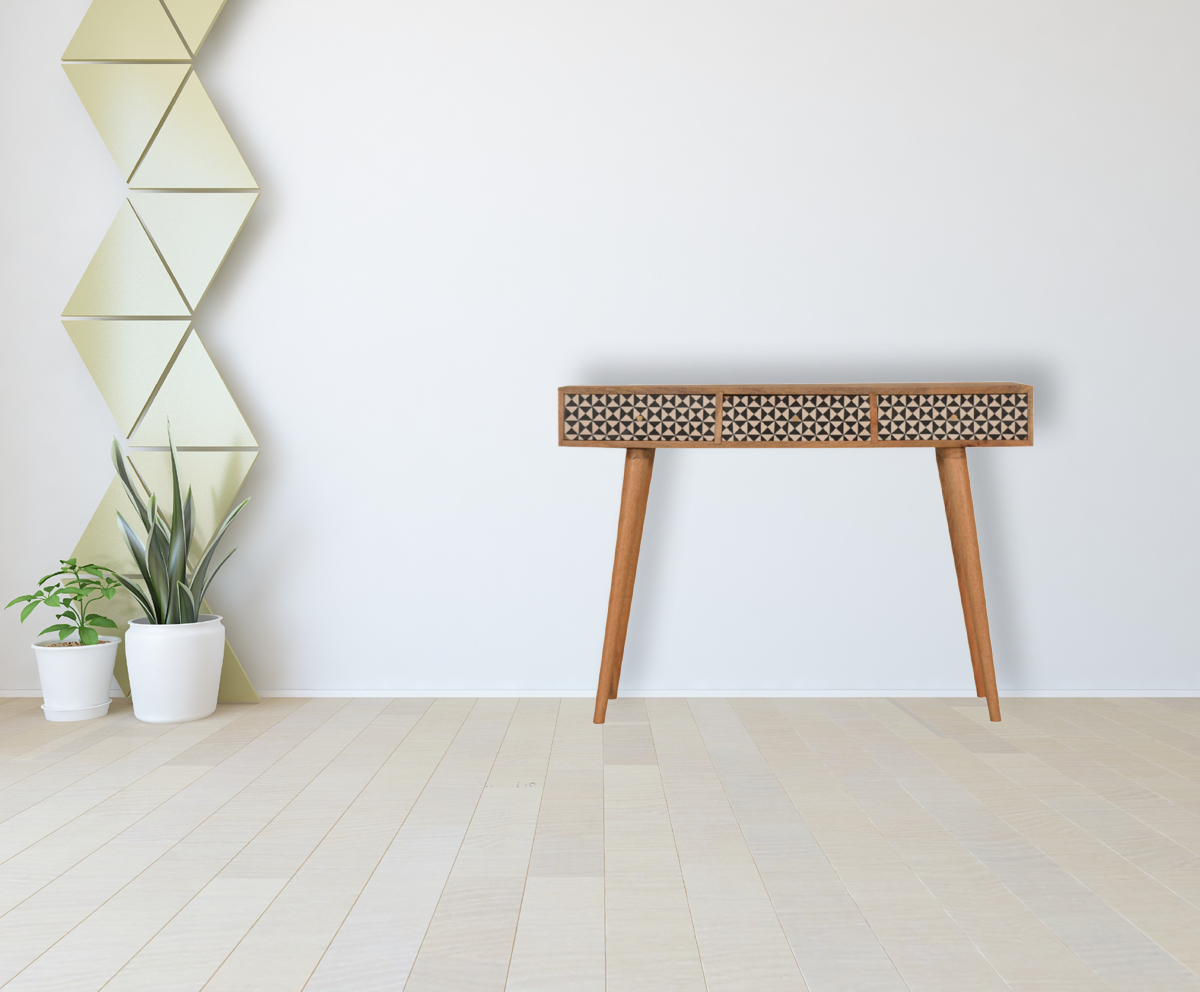 Introducing the Rafina Console Table, crafted from 100% solid mango wood with a beautiful oak-inspired finish. This elegant piece features three spacious drawers for convenient storage and showcases sleek Nordic-style legs paired with shiny knobs, creating a striking contrast against the printed surface. Complete your space with additional coordinating items from the Rafina collection.