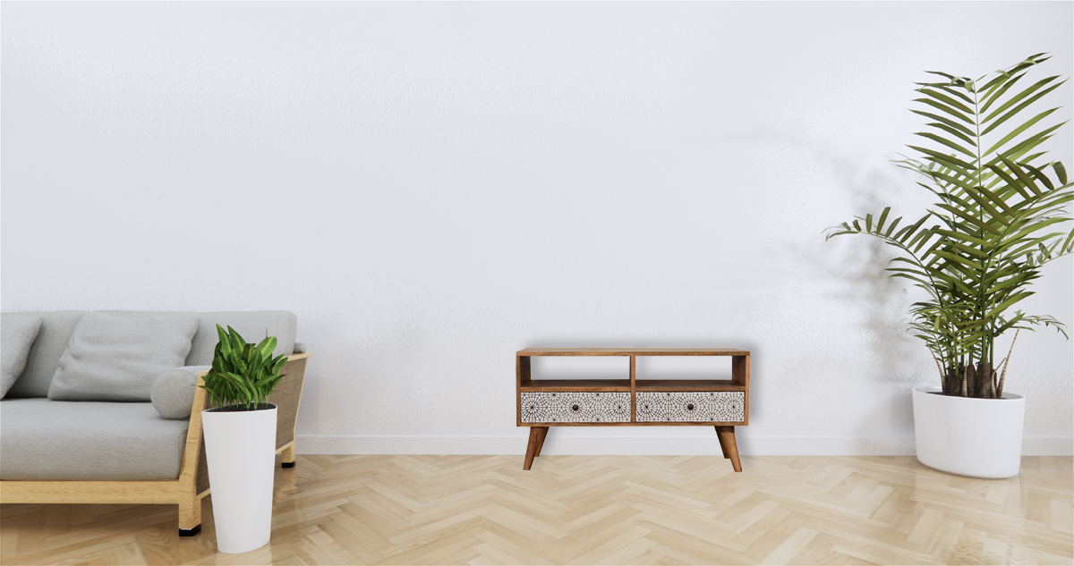 Crafted from 100% solid mango wood, this 2-drawer media unit features a sleek oak-inspired finish that adds warmth and elegance to any space. Its standout design includes screen-printed drawer fronts adorned with striking black and white geometric patterns, complemented by Nordic-style legs and polished knobs for a modern touch. Offering practical storage solutions, the unit includes spacious drawers and open compartments perfect for organizing CDs, films, books, and more, combining style and functionality effortlessly.