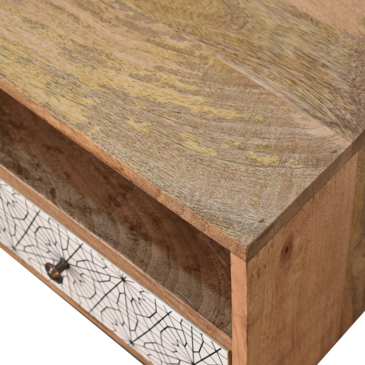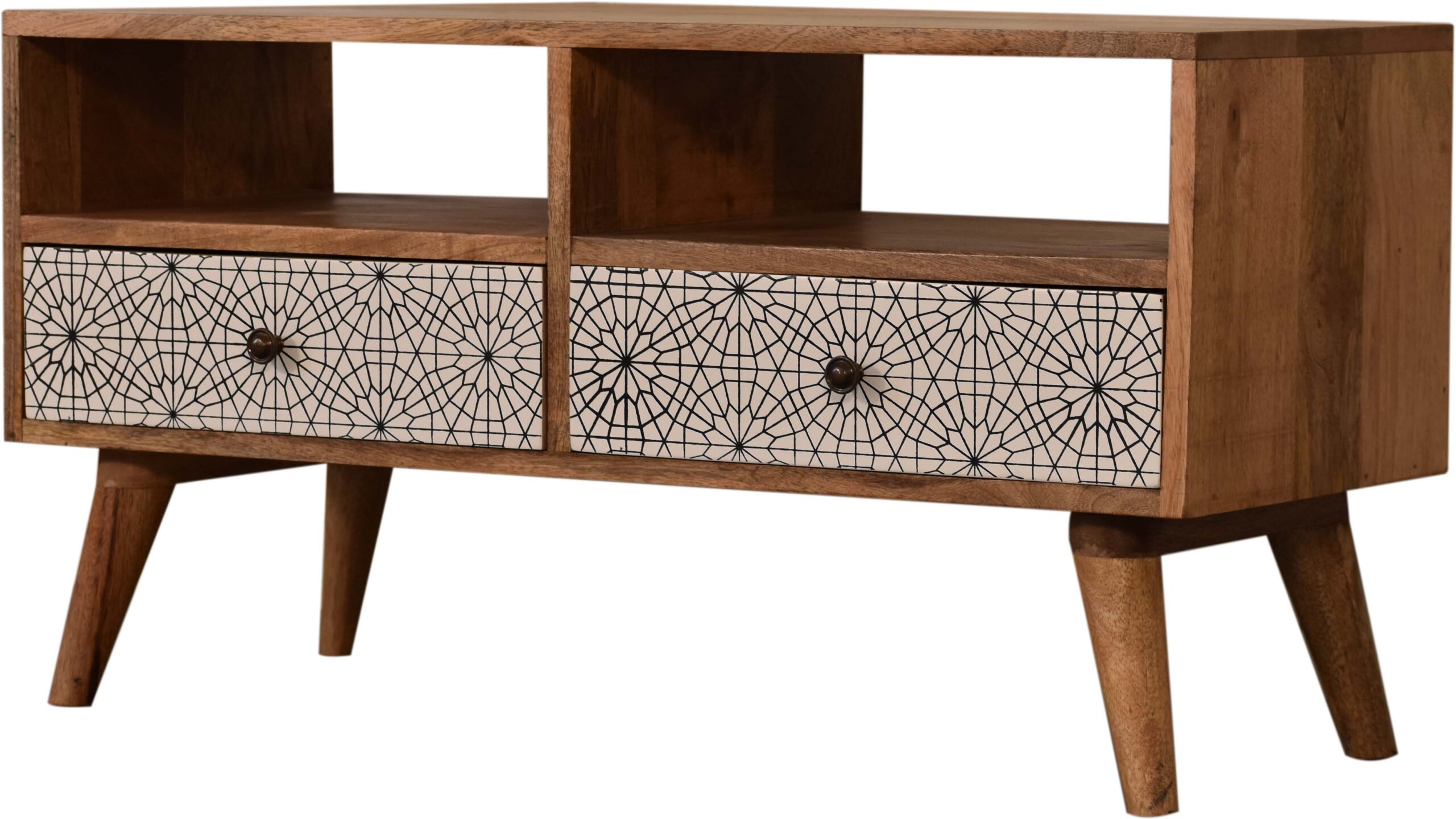 Crafted from 100% solid mango wood, this 2-drawer media unit features a sleek oak-inspired finish that adds warmth and elegance to any space. Its standout design includes screen-printed drawer fronts adorned with striking black and white geometric patterns, complemented by Nordic-style legs and polished knobs for a modern touch. Offering practical storage solutions, the unit includes spacious drawers and open compartments perfect for organizing CDs, films, books, and more, combining style and functionality effortlessly.