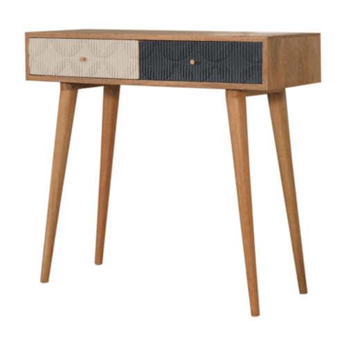 Crafted from 100% solid mango wood, this elegant piece showcases sleek Nordic-style legs for a contemporary touch. It offers practical storage with two spacious drawers, each adorned with a polished knob. The hand-carved white and navy ribbed design beautifully complements the warm oak-toned finish, creating a modern and stylish statement for any room.