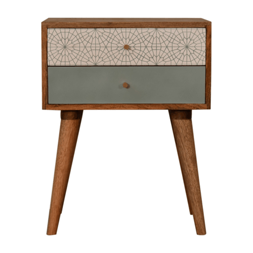 This bedside table is the perfect stand for any bits and pieces you wish to keep nearby before bedtime. It features ample space for a lamp, photo frame, or any ornaments. It has been constructed from 100% solid mango wood with a fine oak-ish finish body with one green and one patterned drawer. A lovely pop of colour and addition to the home.