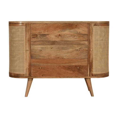 This stylish cabinet combines 2 woven-style door fronts with a smooth oak-ish finish body and legs. Constructed from 100% solid mango legs it features 3 spacious drawers perfect for storage, shiny knobs on the drawers, and nordic style legs. Make full use of this cabinet in the living room or bedroom and partner it with the rest of the collection.