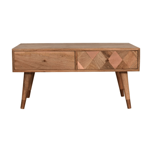 Crafted from 100% solid mango wood with a warm oak-inspired finish, this coffee table combines durability with timeless style. Its clean, minimalist design complements a variety of home décors. The table includes two spacious drawers, each adorned with a striking copper accent on the front, adding a touch of elegance. Supported by four Nordic-style legs, finished with plated feet for refined detail, this piece offers both functionality and sophisticated charm.