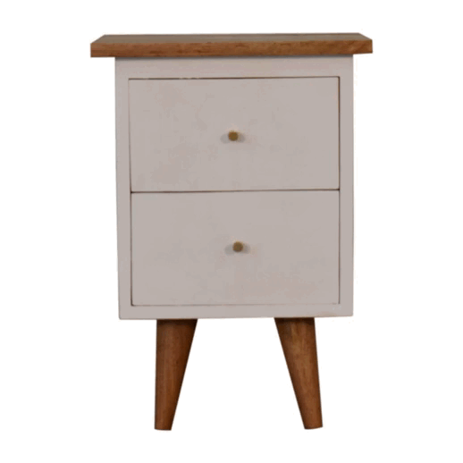 Crafted from 100% solid mango wood, this bedside table features a sleek oak-toned top and stylish Nordic-inspired legs. The body is beautifully hand-painted in white, complemented by two drawers with polished knobs for effortless access. A perfect blend of natural charm and modern design, this bedside table will add a fresh, elegant touch to your bedroom.