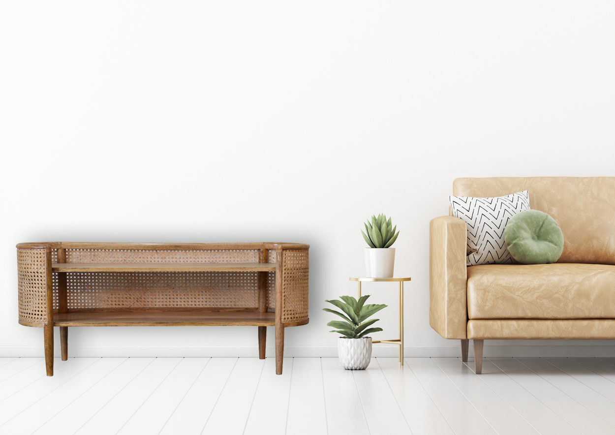 The Larissa curved shelving unit will stand out in your interior thanks to its understated look and subtle originality. The beautiful grain pattern and rattan design are a lovely addition along with the 2 large open shelves and ample space on top for storage. Perfect for the living room. It has been constructed from 100% solid mango wood in an oak-ish finish and features straight legs.