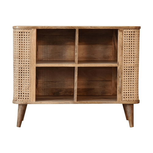 The Larissa open cabinet will stand out in your interior thanks to its understated look and subtle originality. The beautiful grain pattern and rattan design do not make this cabinet any less functional. In fact, it has 4 small shelves and ample space on top for displaying any ornaments, flowers, or candles. It has been constructed from 100% solid mango wood in an oak-ish finish and features nordic style legs.