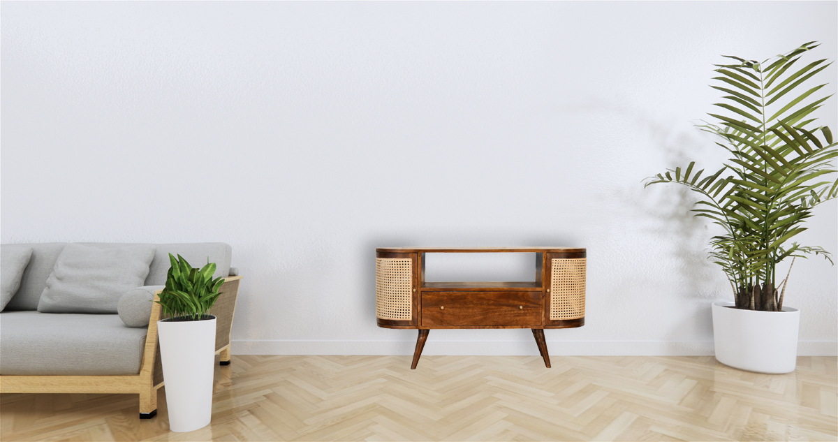 Elevate your living space with this elegant Nordic Woven Media Unit, featuring two woven cabinets set within a sleek chestnut-finished body and sturdy legs. Crafted from 100% solid mango wood, it showcases durable Nordic-style legs and a polished brass knob on the drawer for a touch of sophistication. Perfect for organizing your media essentials, this unit seamlessly complements the rest of the collection to create a cohesive, stylish look in your living room.
