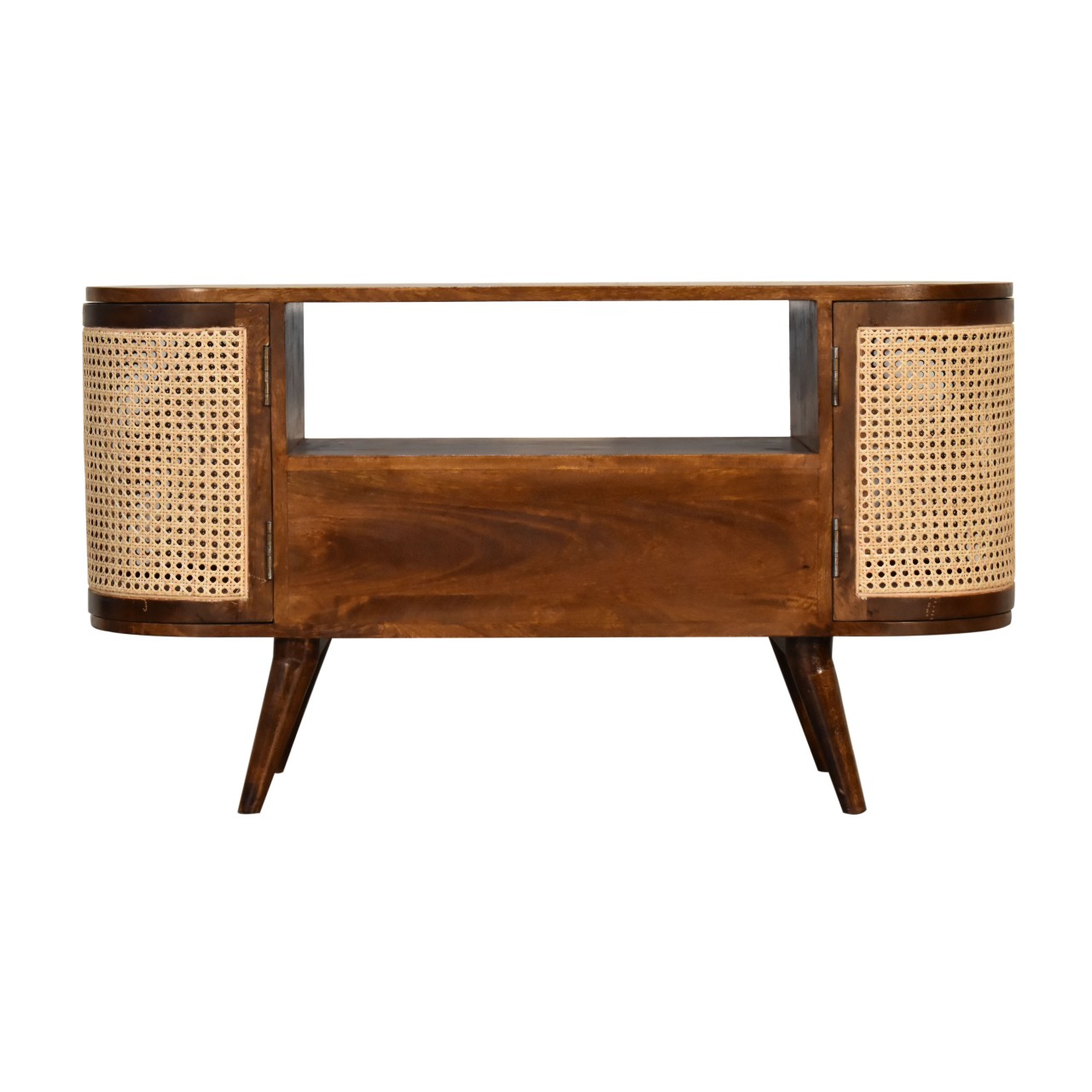 Elevate your living space with this elegant Nordic Woven Media Unit, featuring two woven cabinets set within a sleek chestnut-finished body and sturdy legs. Crafted from 100% solid mango wood, it showcases durable Nordic-style legs and a polished brass knob on the drawer for a touch of sophistication. Perfect for organizing your media essentials, this unit seamlessly complements the rest of the collection to create a cohesive, stylish look in your living room.