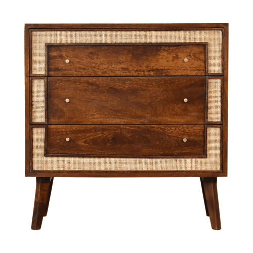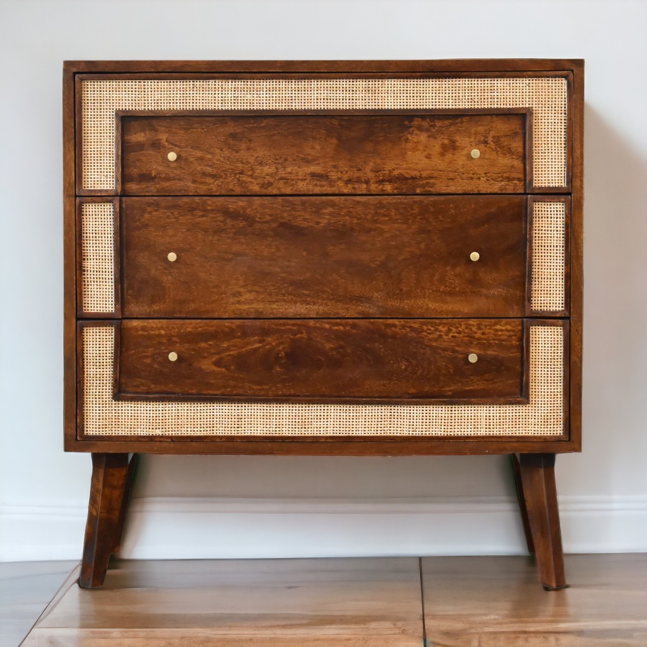 Elevate your bedroom with this elegant Chestnut Woven Chest, featuring smooth chestnut-finished drawers and legs beautifully contrasted by a light woven design. Crafted from 100% solid mango wood, it offers durability and timeless appeal. The chest includes three spacious drawers with shiny knobs, complemented by sleek Nordic-style legs for a modern touch. Perfect for stylish storage, this piece pairs seamlessly with the rest of the collection to complete your room’s look.