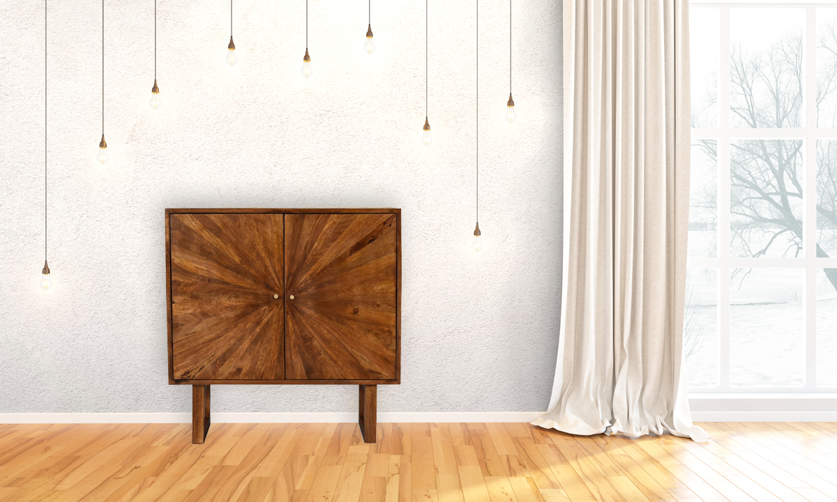 This cabinet is crafted from 100% solid mango wood and features a rich chestnut finish with a striking sunrise pattern. Accented by glossy candle-shaped knobs, it combines modern and retro styles to create a timeless piece. Designed to provide practical and stylish storage, this cabinet is a perfect addition to any home.