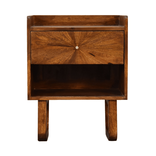 This chestnut bedside table is the ideal storage companion for any room. Crafted from 100% solid mango wood and finished with a rich chestnut tone, it combines durability with timeless elegance. Featuring a stylish sunrise design, it adds a sophisticated and eye-catching touch to your space while providing practical storage wherever you need it.