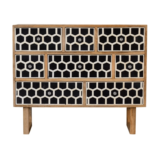 Bring warmth and character to your space with this charming chest, crafted from 100% solid mango wood finished in a rich oak tone. Featuring three spacious drawers, it offers ample storage while its unique bone inlay—ethically sourced from naturally deceased animals like camels, goats, and buffaloes—adds an elegant, modern touch. Perfect for creating a cozy, stylish atmosphere in any room.