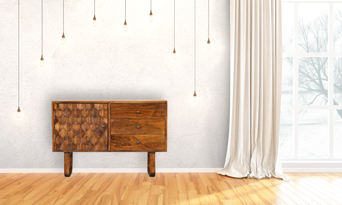 This elegant chestnut sideboard offers three spacious drawers, providing ample storage for all your essentials. Each drawer is adorned with a beautifully carved pineapple design, adding a unique and captivating touch that brings character and charm to the piece. Crafted from 100% solid mango wood and finished in a rich chestnut tone, this sideboard combines durability with timeless style, making it a stunning addition to any room.