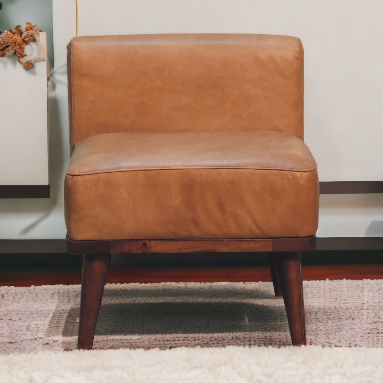 Introducing our Tan Buffalo Leather Footstool with Backrest – where comfort meets style. Sink into soft, warm tan leather, while the backrest adds support. It’s crafted with care for a touch of romance in any space. Other features include nordic style legs which have been constructed from 100% solid mango wood in a chestnut finish.