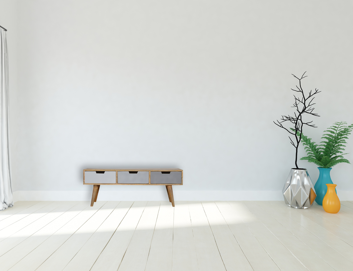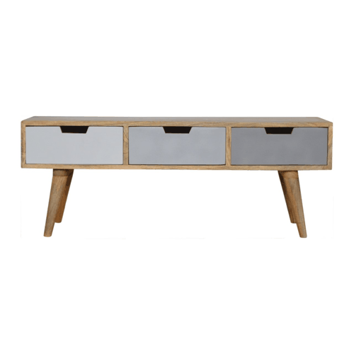 This media unit is crafted from 100% solid mango wood, finished in a warm oak-inspired tone. Its clean, minimalist design complements a variety of home styles. The unit includes drawers hand-painted in three elegant shades of grey, adding subtle contrast and character. Elevated on four Nordic-style legs, it offers a spacious tabletop perfect for your TV and additional media accessories.