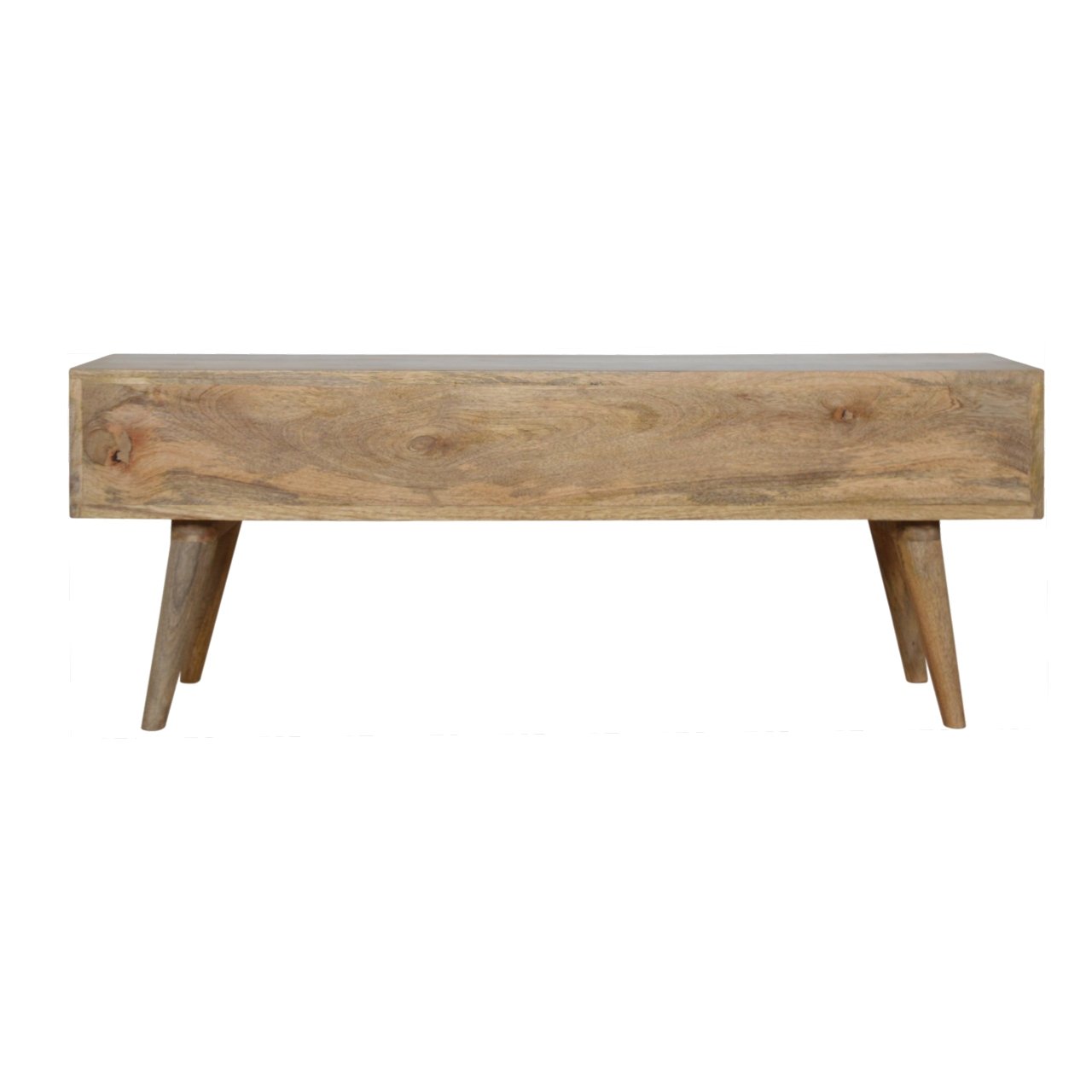 This media unit is crafted from 100% solid mango wood, finished in a warm oak-inspired tone. Its clean, minimalist design complements a variety of home styles. The unit includes drawers hand-painted in three elegant shades of grey, adding subtle contrast and character. Elevated on four Nordic-style legs, it offers a spacious tabletop perfect for your TV and additional media accessories.