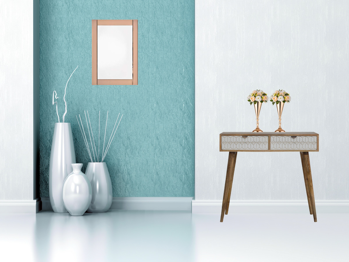 Crafted from 100% solid mango wood, this 2-drawer console table features a warm oak-inspired finish that highlights its natural beauty. The standout design element is the white-painted, intricately carved drawer fronts, offering a striking contrast against the wood for a charming, elegant look. The spacious drawers provide ample storage for organizing essentials in your hallway or living space. Supported by four sleek Nordic-style legs, this console table also includes a generously sized tabletop, perfect for working, studying, or displaying decorative items.