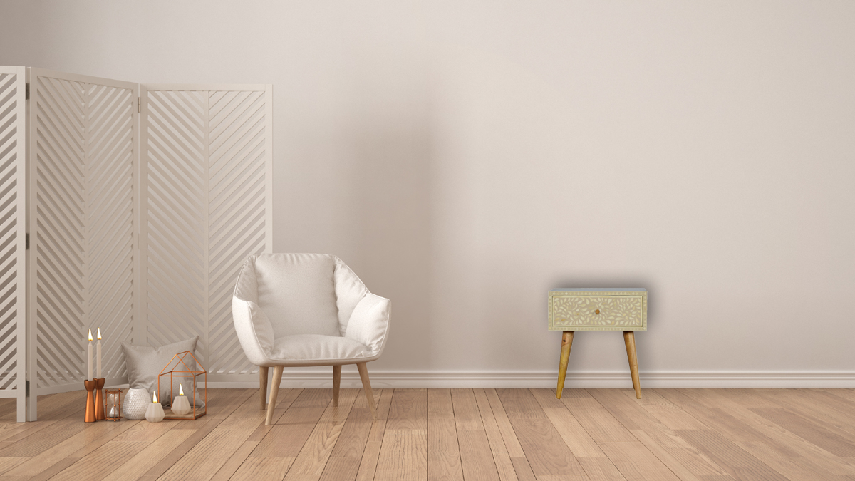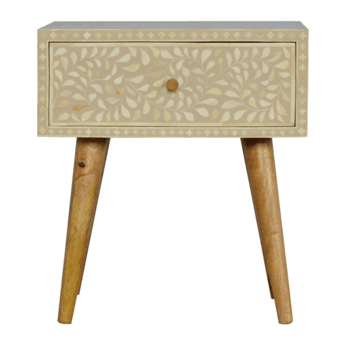 Crafted from 100% solid mango wood, this bedside table showcases a beautifully detailed drawer adorned with a floral bone inlay design. Finished in a soft grey hue with an oak-inspired base and sleek Nordic-style legs, it combines elegance with functionality. The spacious drawer provides ample storage for your essentials, making it perfect for keeping everyday items within easy reach. Whether paired with other pieces from the collection or used as a standalone accent alongside another bedside table, this piece adds a touch of timeless charm to any bedroom.