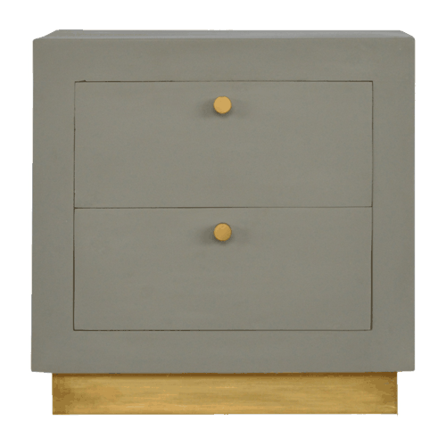 This bedside has been inspired by a clean, modern finish design. Constructed from Mango wood with MDF sides its main feature is the cement finish with the beautiful golden base and detail which compliments the piece beautifully. It has 2 drawers for handy storage and 2 round gold knobs providing easy access into the drawers.
